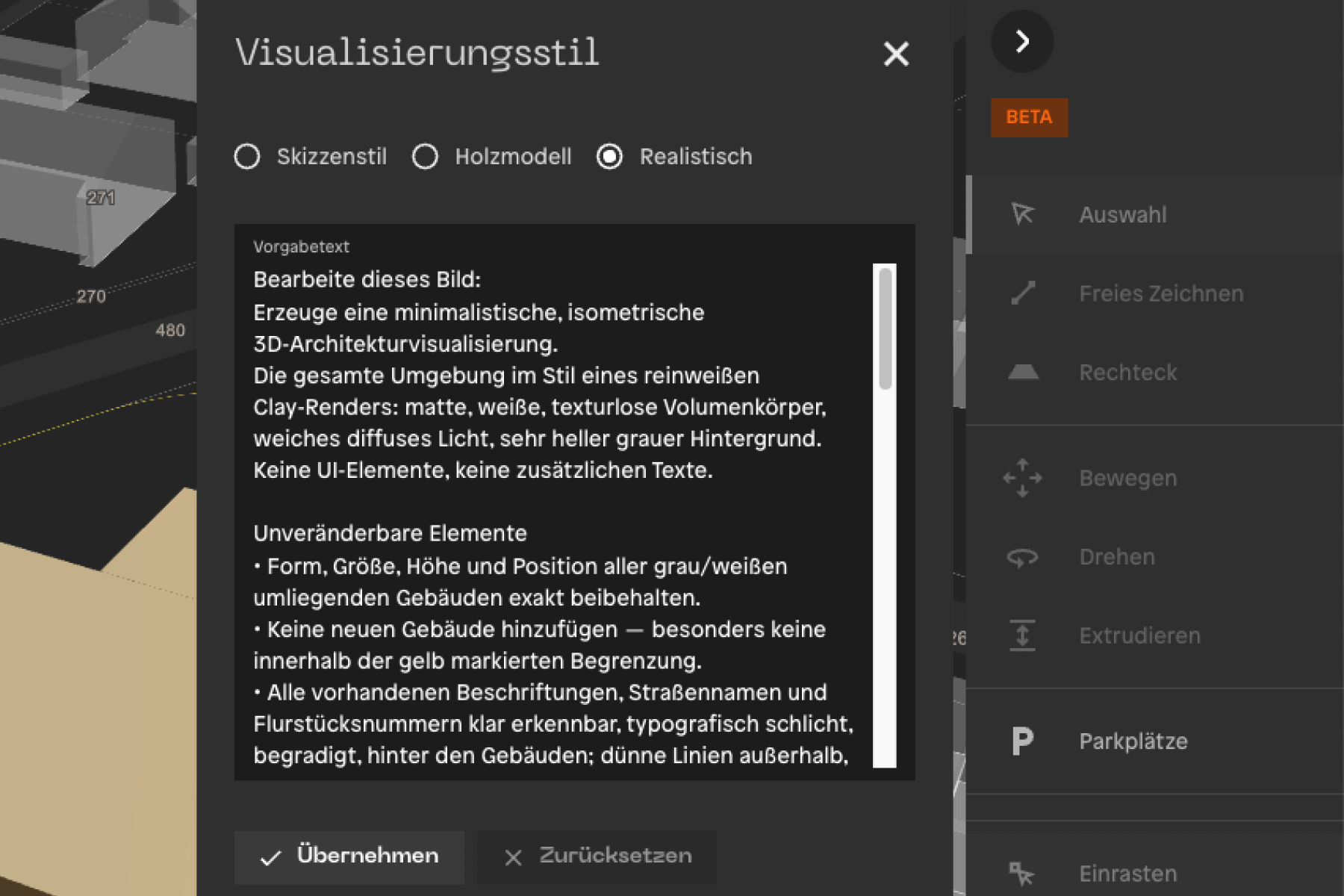 Zusätzlich gibt es ein Freitext-Promptfeld, mit dem Sie der KI konkrete Anweisungen geben können. So lassen sich zum Beispiel verschiedene Zeichenstile und atmosphärische Varianten ausprobieren. Die KI-Visualisierungen können Sie downloaden und direkt weiterverwenden, zum Beispiel für Projektpräsentationen oder interne Entscheidungsrunden.